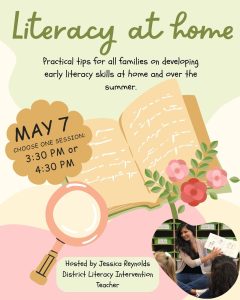 We’re also pleased to offer two “Literacy at Home” information sessions led by our District Literacy Intervention Teacher, Jessica Reynolds. Sessions will take place at 3:30 pm and 4:30 pm on this day (May 7) in the Staff Room. Jessica brings extensive experience supporting student reading in both English and French. Please see the attached poster for more details.